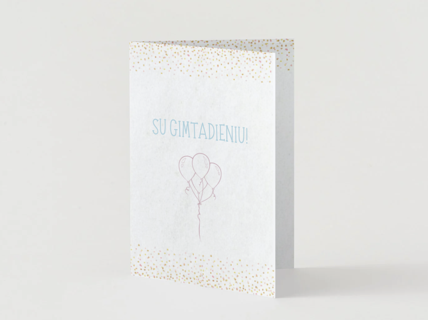 Priekinėje pusėje – užrašas „SU GIMTADIENIU!“, o viduje – nuoširdus palinkėjimas.