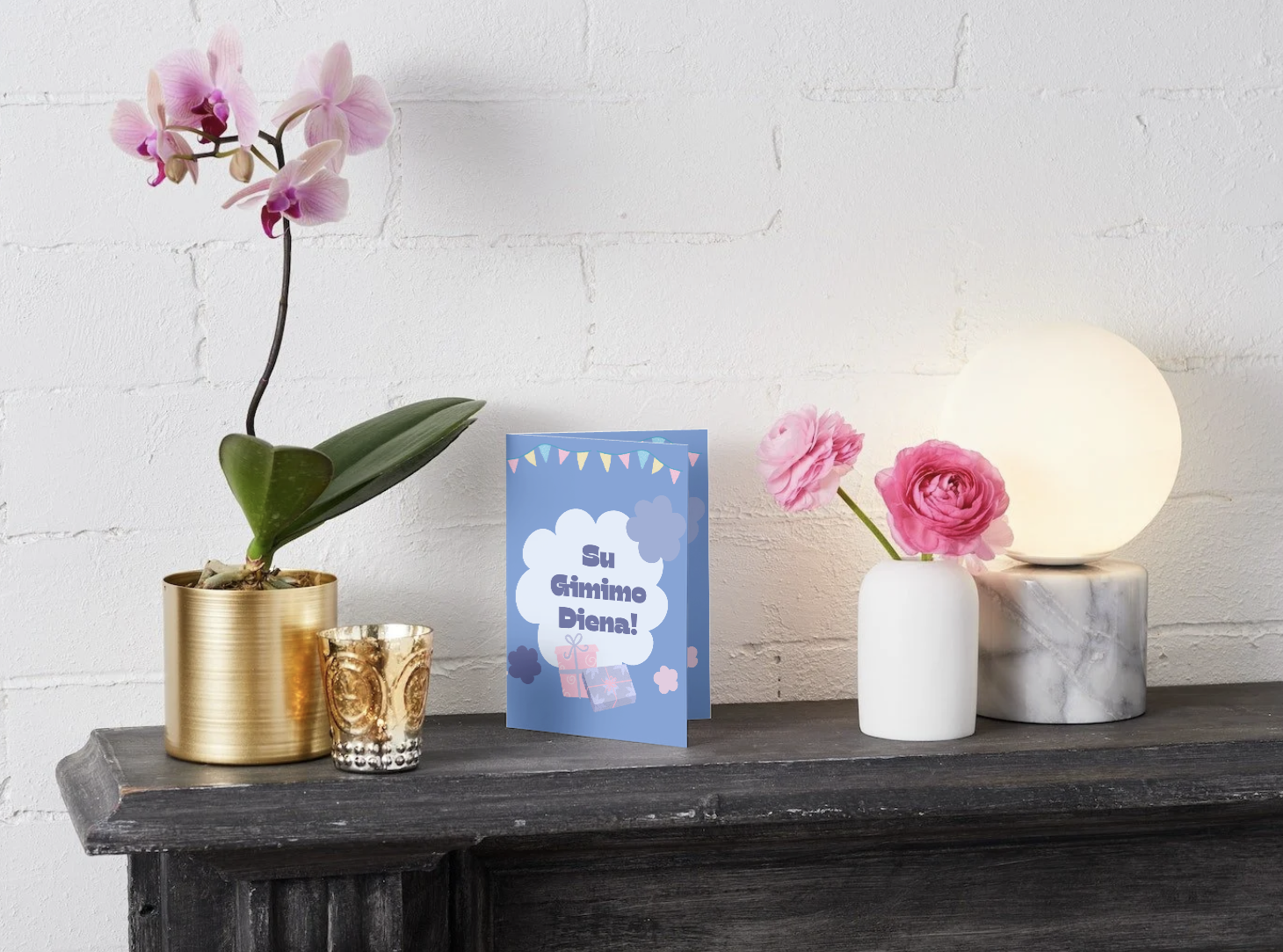 Atviruko priekyje – dovanėlės ir užrašas „Su Gimimo Diena!“, o viduje – šiltas palinkėjimas: „Tegul Tavo metai būna pilni spalvų!“